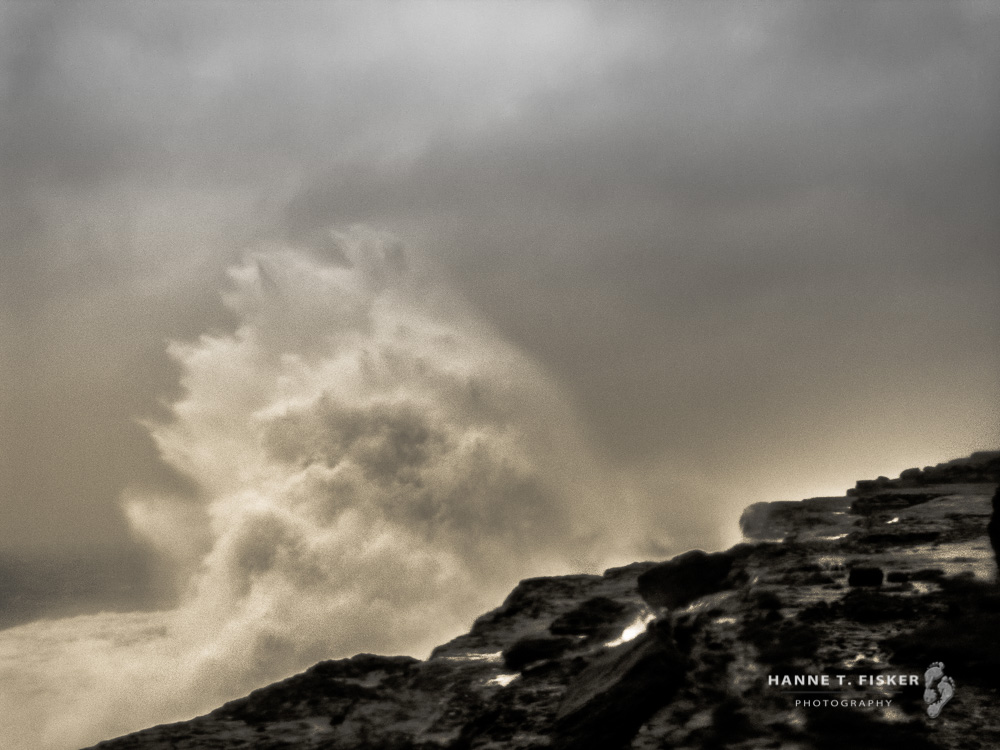 Not an easy task to keep the lens dry and get a clear shot in the whirling rain and sea spray from the wild waves crashing in, whilst the wind is battering around a body that’s trying to hold the camera still. I obviously didn’t succeed and yet these last two photographs of Winter Storm (VII) and (VIII) holds the atmosphere of the moment and I decided to create some extra light that shows how my inner eye experienced it to be out there, embraced by the arms of the wild and untamed.